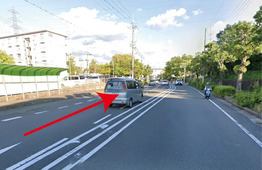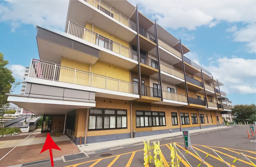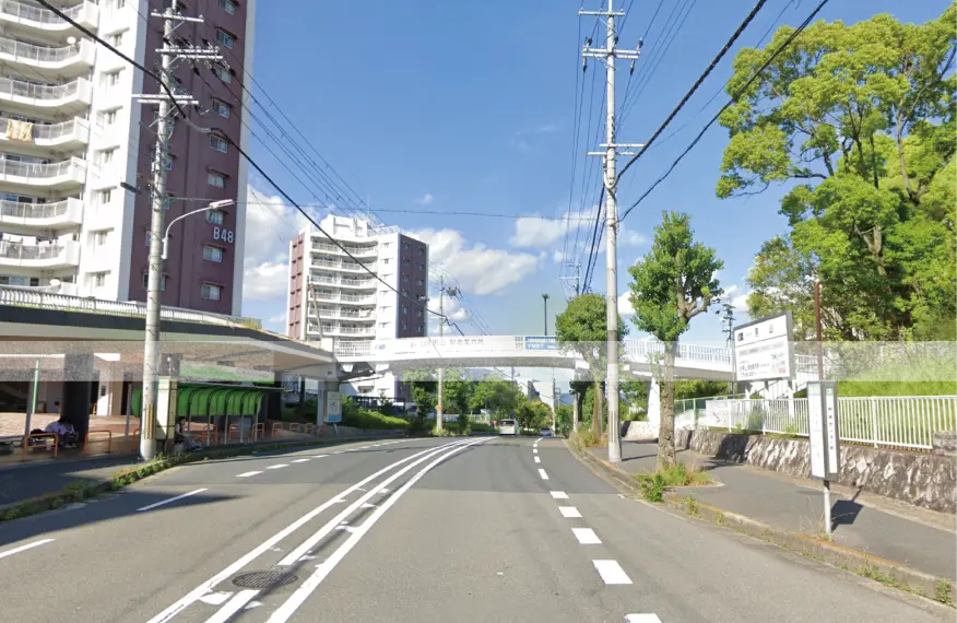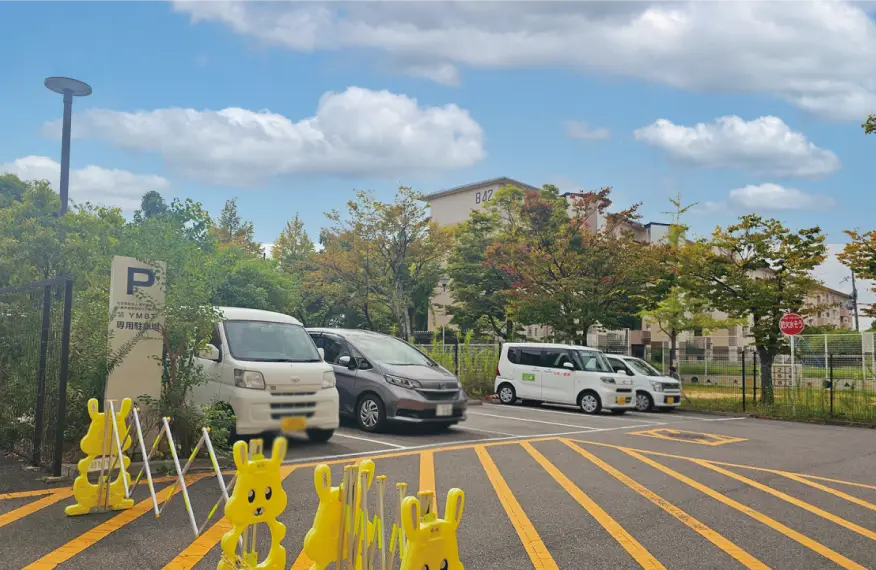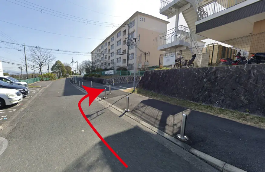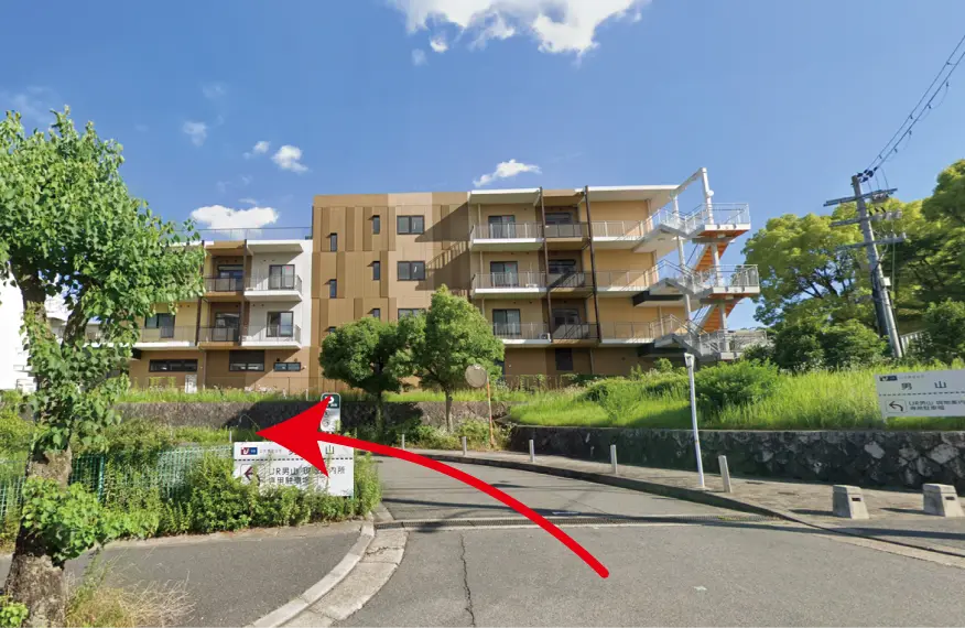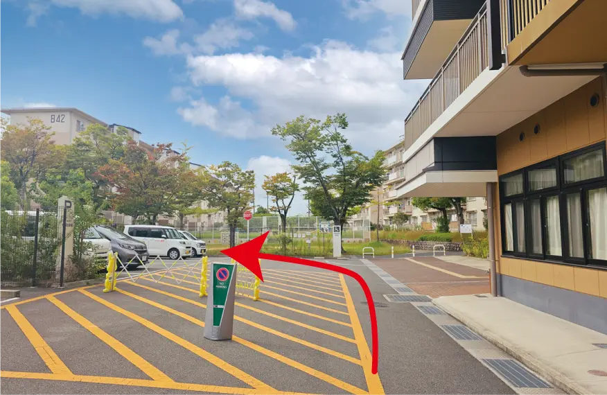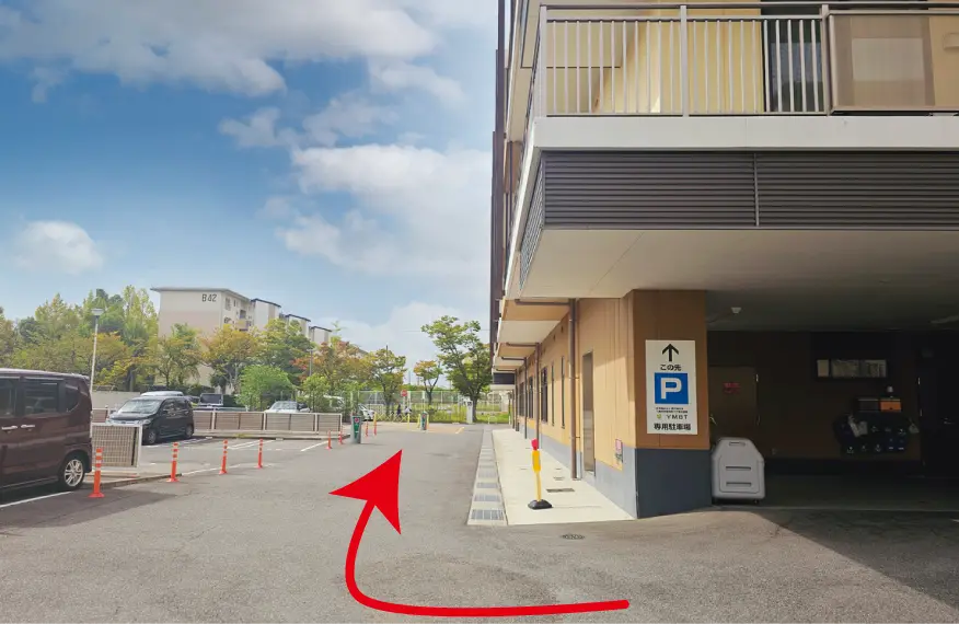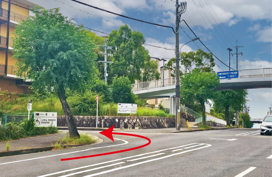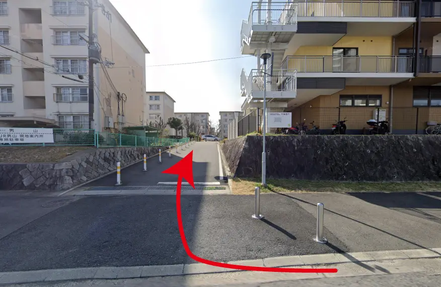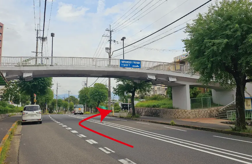 正面に見えるベージュの建物がYMBTです。道なりに左へ進みます。